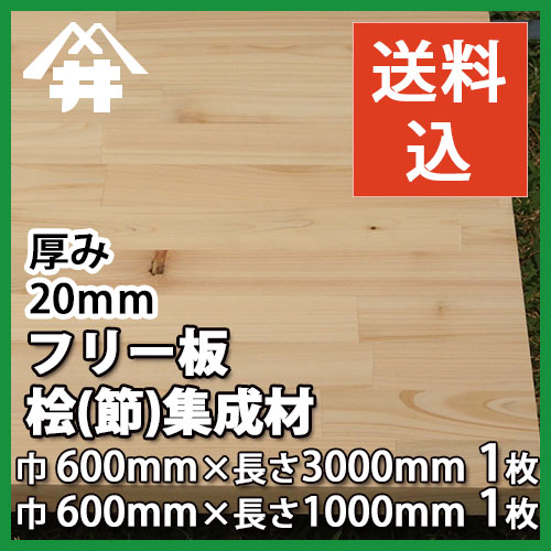 【送料込】プロ・工務店様用 フリー板 桧(節)集成材 サイズ:厚み20mm×巾600mm×長さ3000mm・・・1枚、長さ1000mm・・・1枚/無節タイプよりお値打ちな国産の木材。/板/長尺/天板/リノベーション/無垢集成/棚板/造作材/家具材/内装材/木材