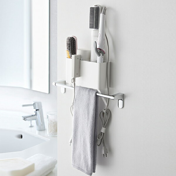 商品名山崎実業 タワー【tower】タオル掛け上ドライヤー&ヘアーアイロンホルダーカラーホワイト(4286)、ブラック(4287)サイズ幅 22cm × 奥行 7.5cm × 高さ 24cm本体重量:約700g耐荷重:ホルダー 約2kg、フック1つあたり 約500g仕様取り付け可能なタオルバー:内寸幅20cm、奥行3cm以上必要素材本体:スチール(粉体塗装)マット:シリコーン付属品緩衝材×2商品について【タオル掛け上ドライヤー&ヘアーアイロンホルダー】タオルバーの上にある空間をちょっとした収納スペースに変えることができる収納ラックです。